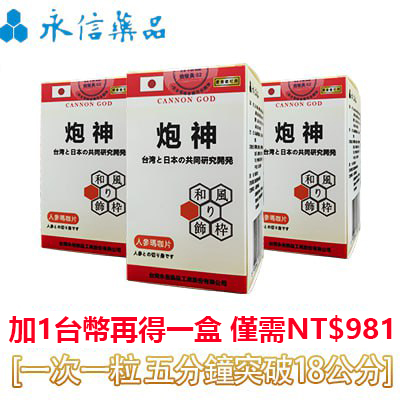 15分鐘前【活動最後1天!可免費領取一瓶!】只需一粒,效果立現--- 脱胎换茎,强悍重生!永信藥業攜手アステラス製藥株式會共同合製 “炮神”登場 衛福部核可服用、全球男人瘋搶!僅需一粒助你壯碩無比,兇猛异常,即刻生效、保你性福一生! 完美解決所有性功能障礙,輕鬆“硬”對自如,藥勁猛烈 - 共3瓶 【加1台幣再得1盒】二盒+試用裝一瓶【限量50组】【炮神】,僅需 NT$981 --- 一次一粒,五分鐘突破18公分!